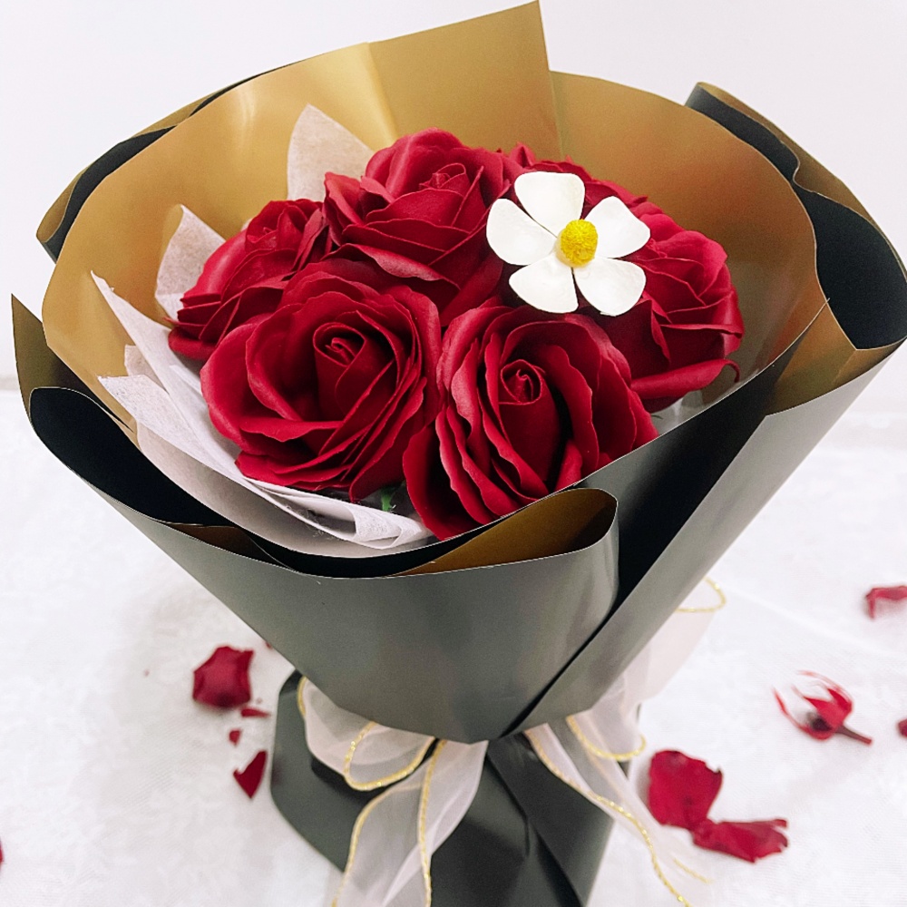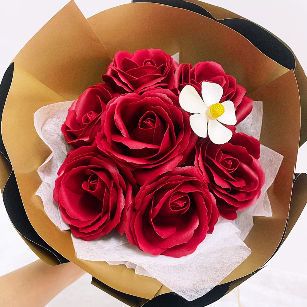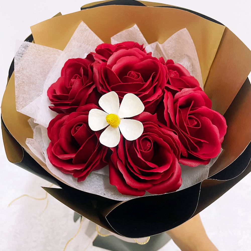 A timeless symbol of love and passion, this bouquet features 7 beautifully handcrafted red soap roses, accented with a delicate white flower for contrast. Each bloom is made from high-quality scented soap, offering a lasting beauty that never fades. Wrapped in elegant gold and black paper with a sheer ribbon, this bouquet is perfect for anniversaries, birthdays, or simply to say “I love you” in the most thoughtful way.