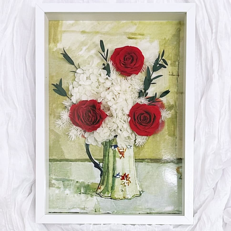 Capture everlasting elegance with this handcrafted photo-frame arrangement featuring vibrant preserved red roses and delicate white hydrangeas. Set against a charming vintage-style background and encased in a wooden shadow box, the flowers retain their natural beauty for years—no watering required. Perfect as a romantic gift, anniversary keepsake, or unique home décor piece.